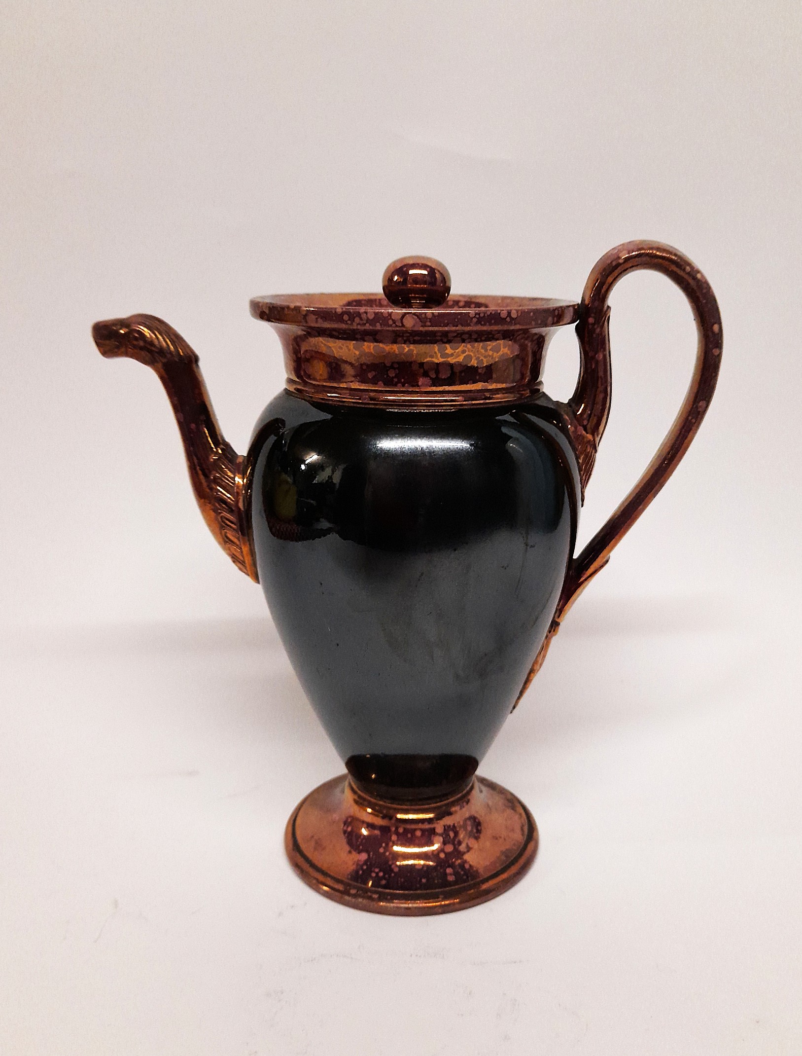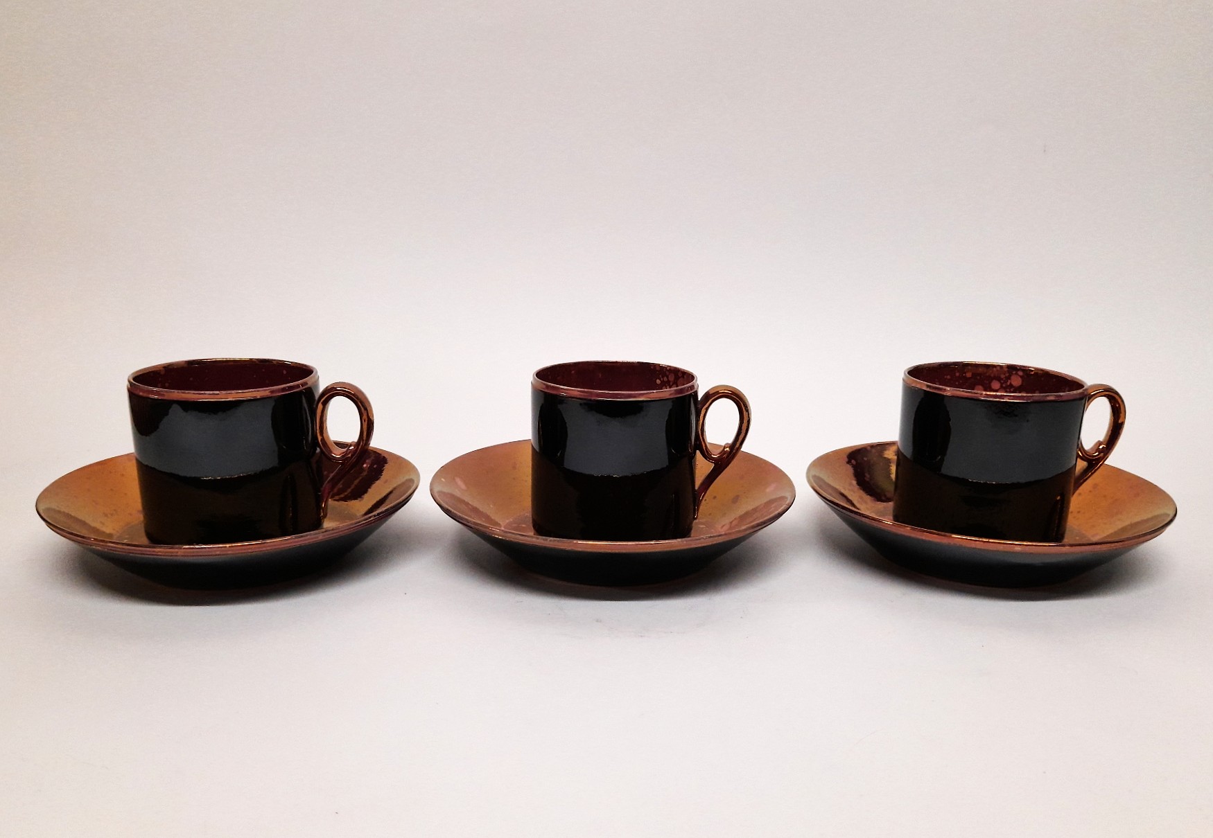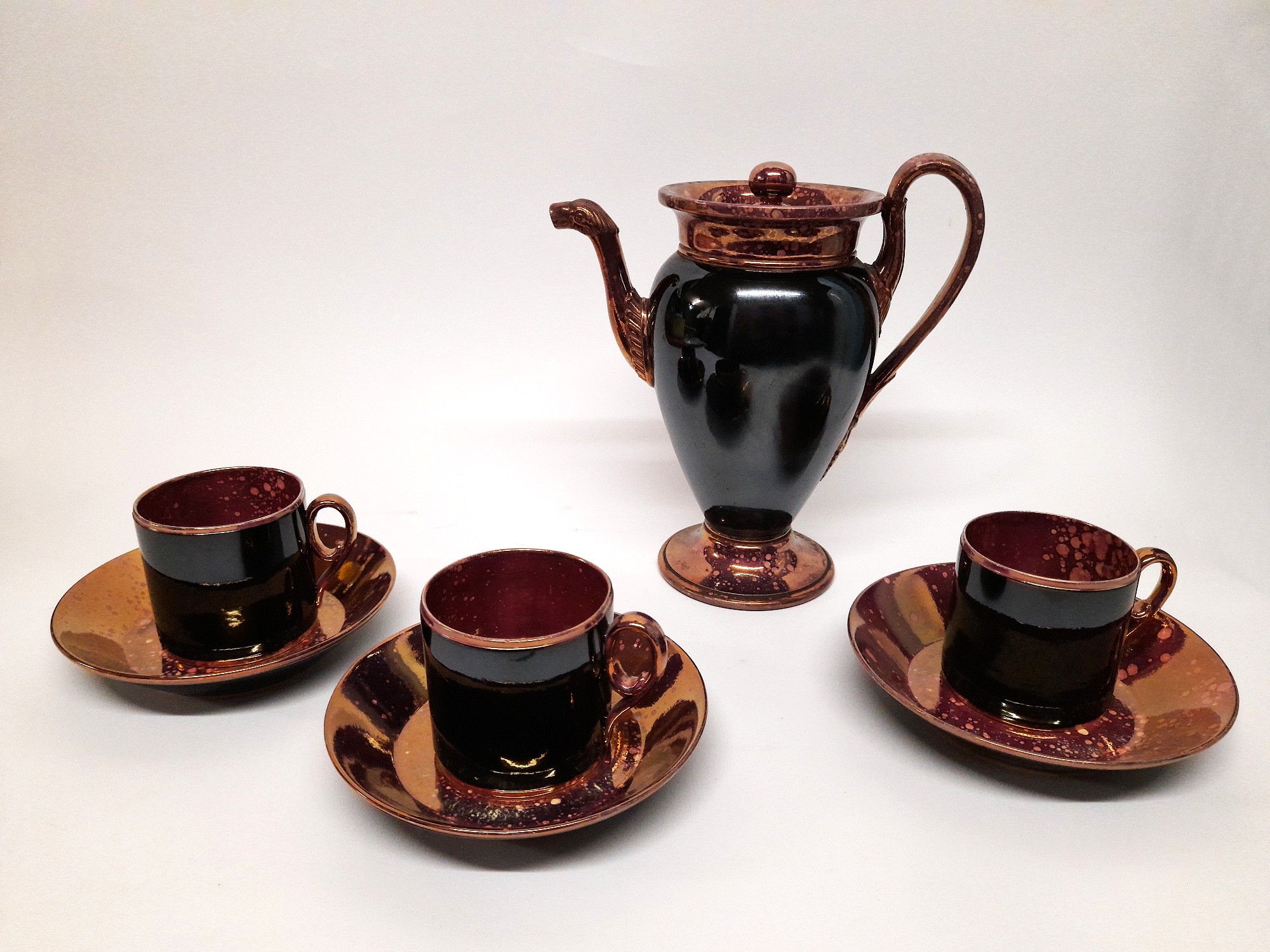 Sarreguemines, rares cafetière et trois tasses dites « litron » en faïence fine à décor de lustre Burgos et engobe noir.
