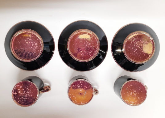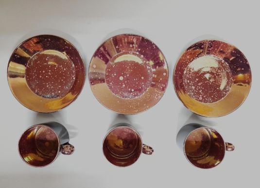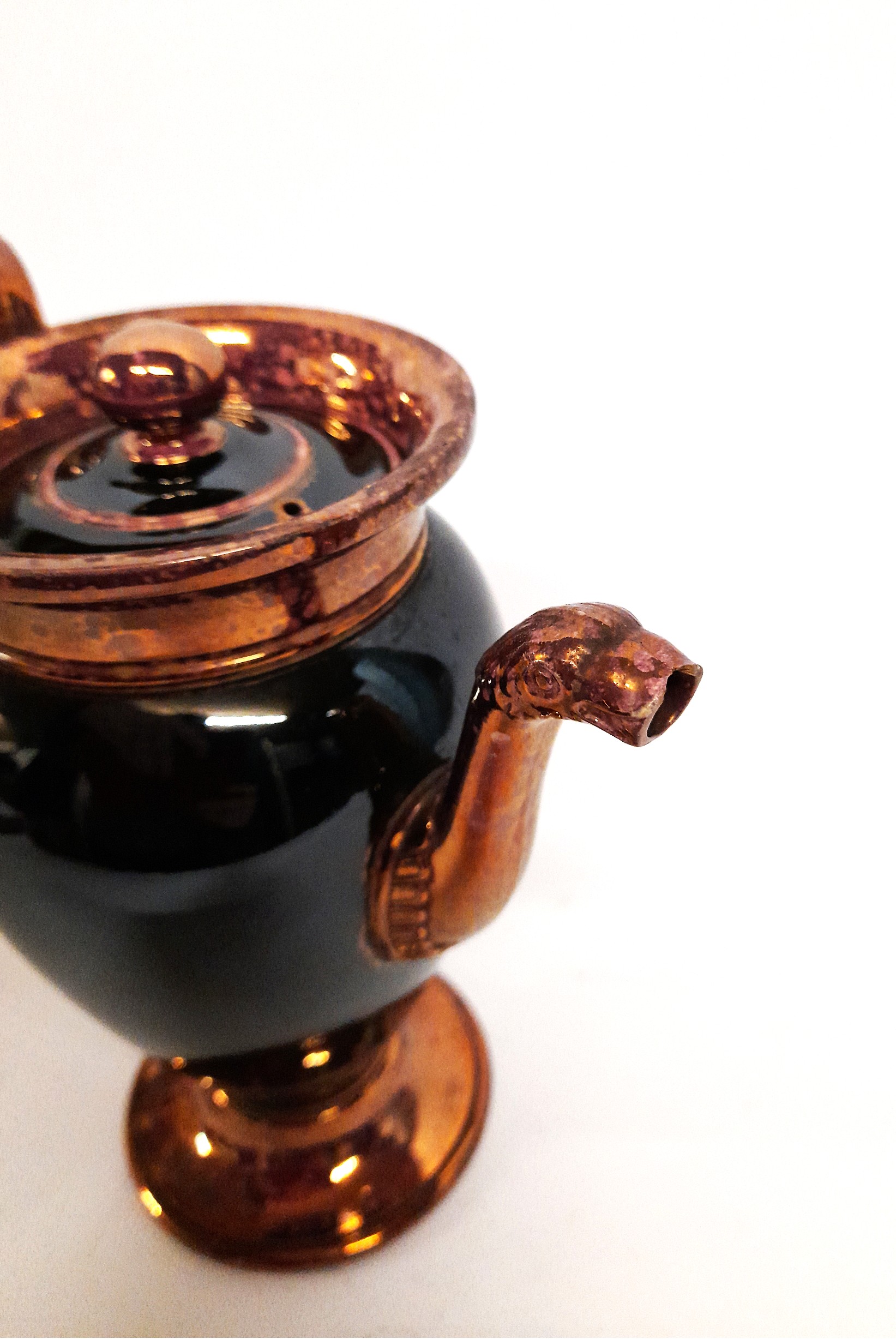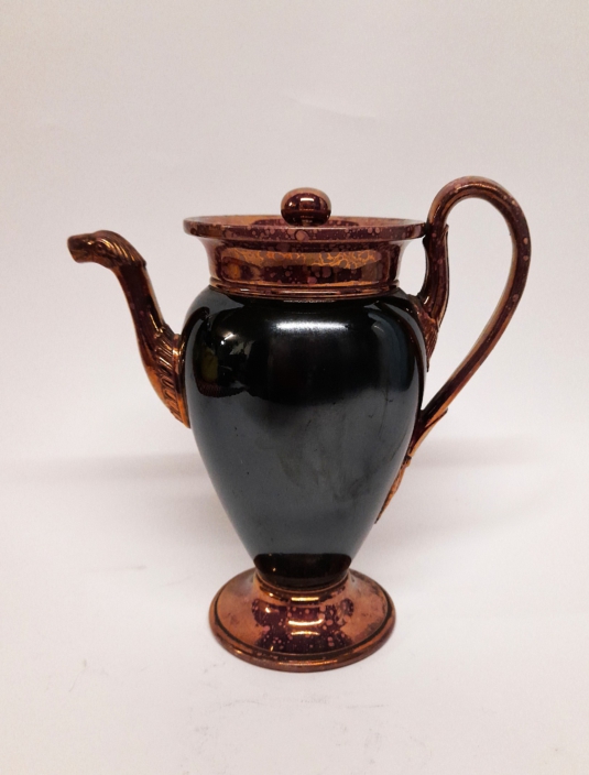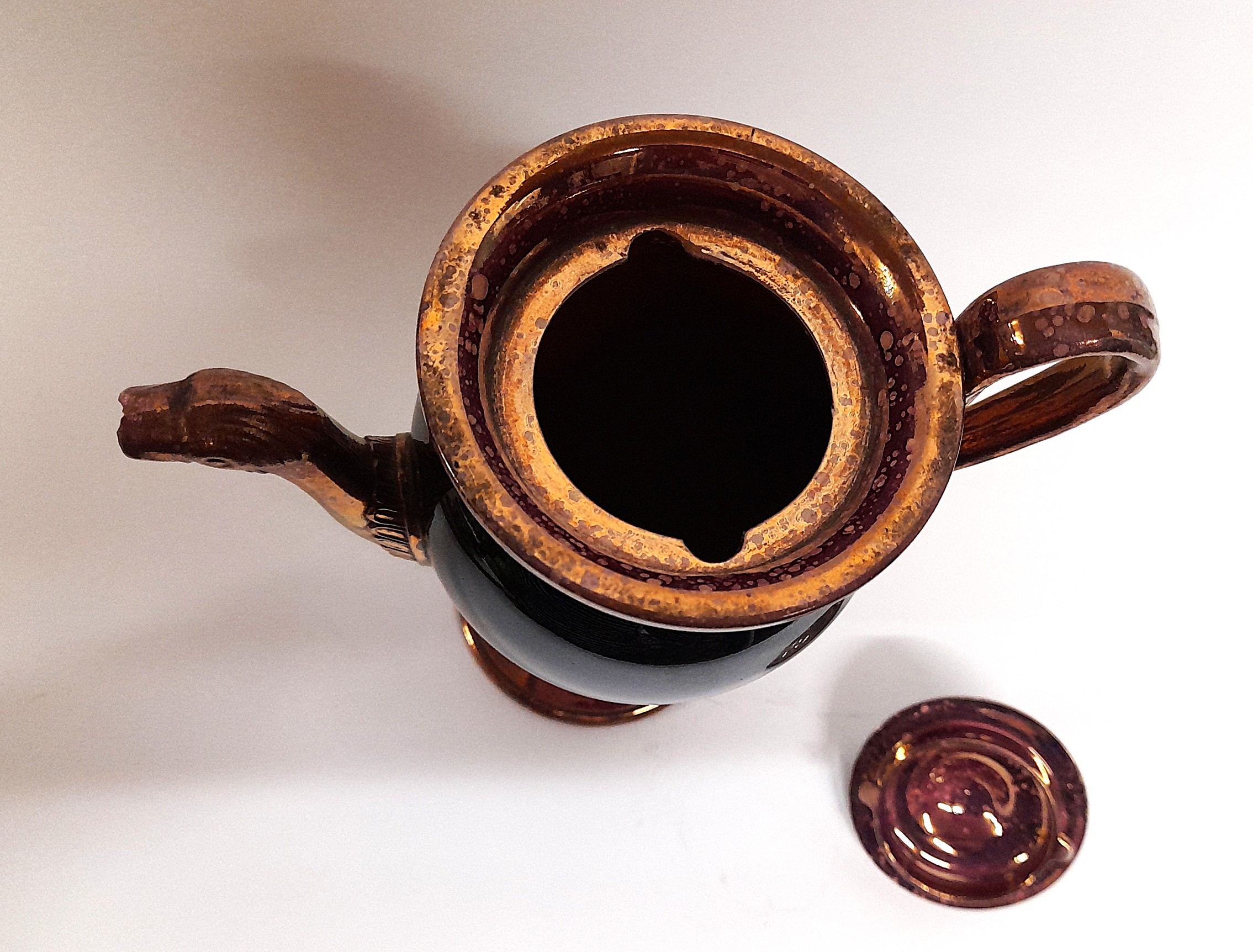 Sarreguemines, rares cafetière et trois tasses dites « litron » en faïence fine à décor de lustre Burgos et engobe noir.